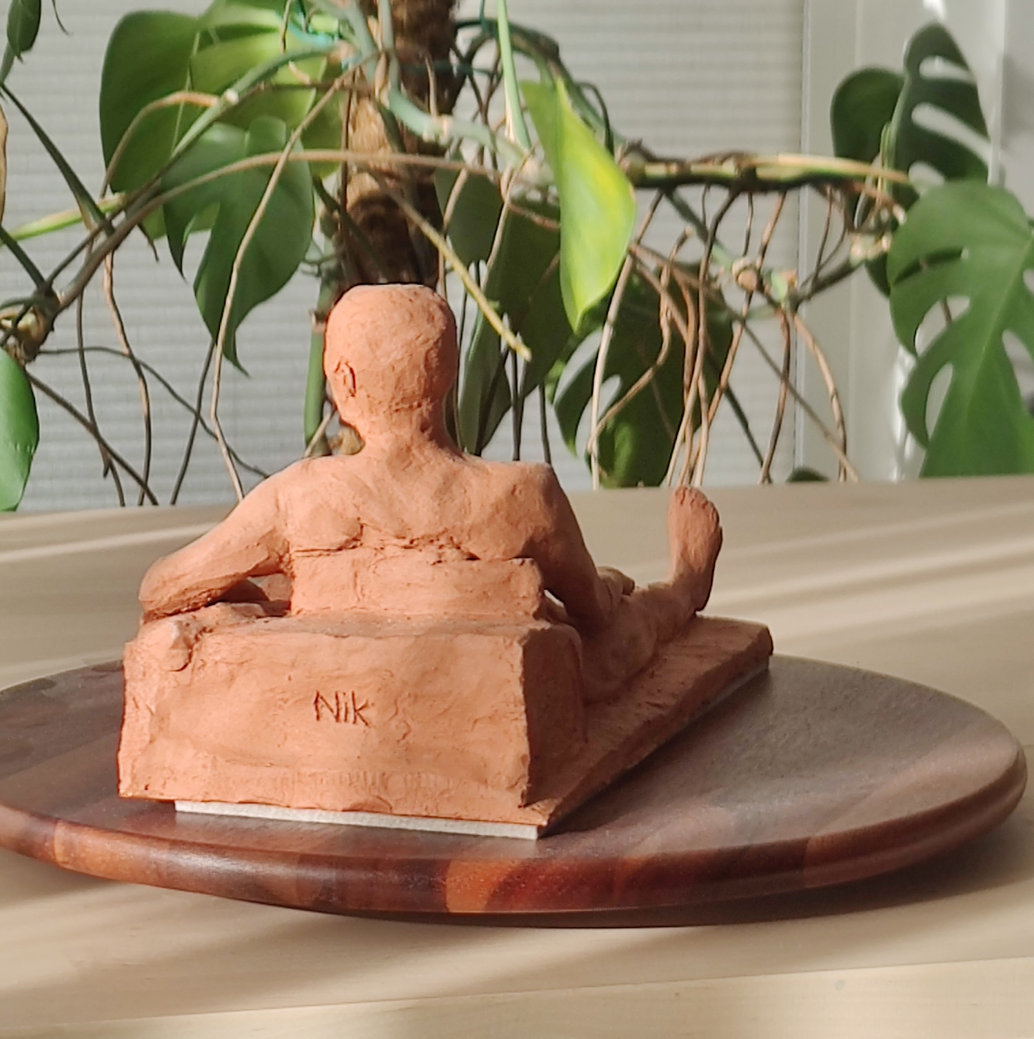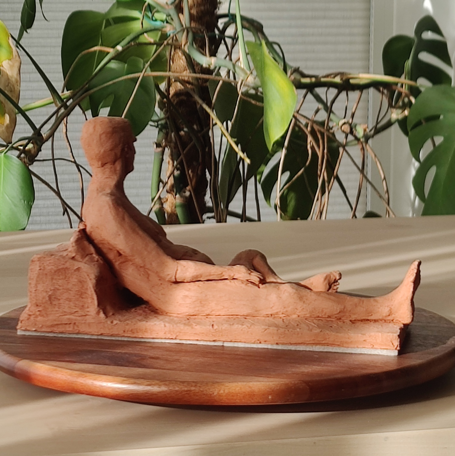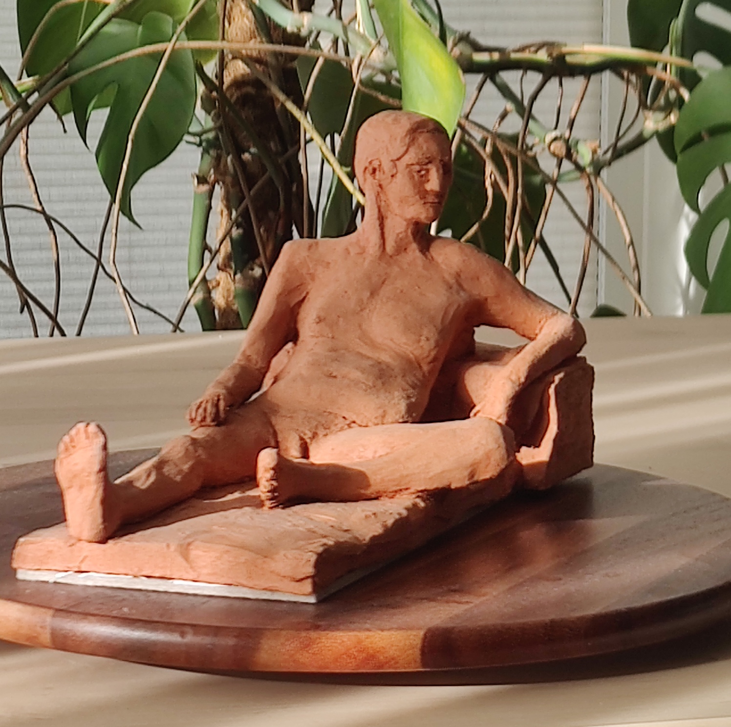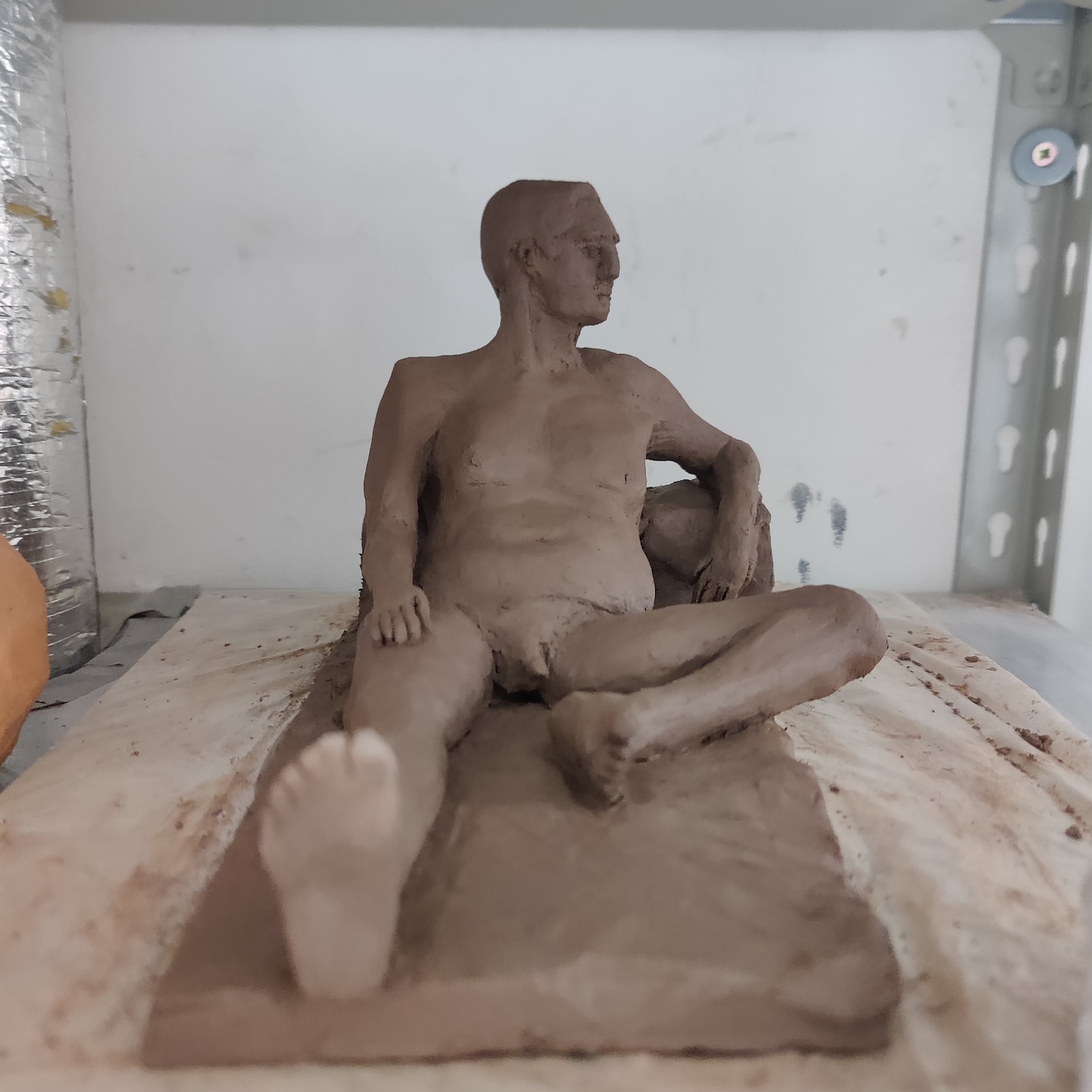 recumbentsummarysculpture type: lifestyle: realistmaterial: terracottafiring: bisquetime spent: 15 hourslocation: working men's collegemodel: tomtutelage: frank harrisartist's notesa realist piece of a reclining nude man. The less-detailed aesthetic is designed to match the relaxed pose of this figure.pre-fired leather hard stagebisque fired stage
